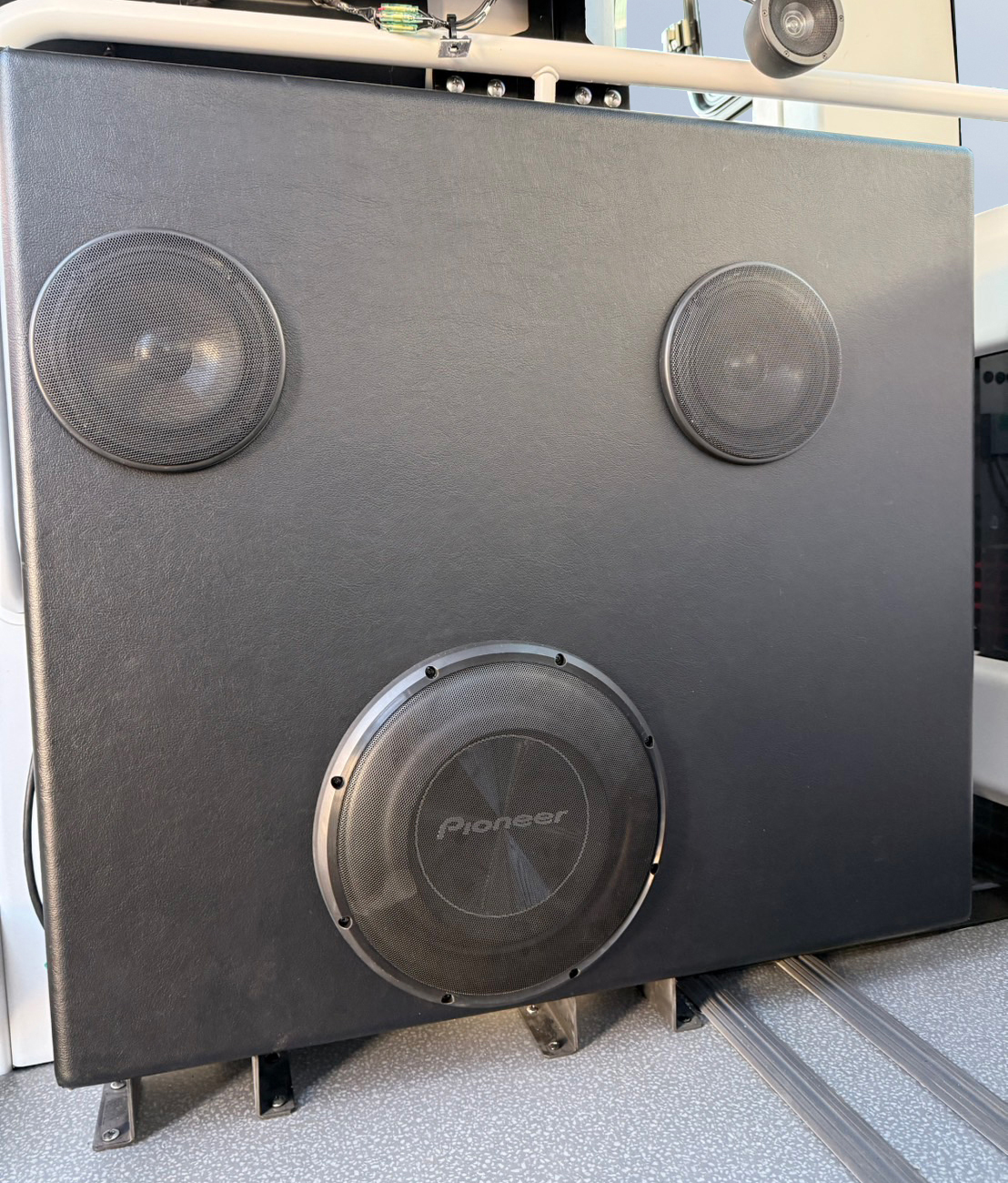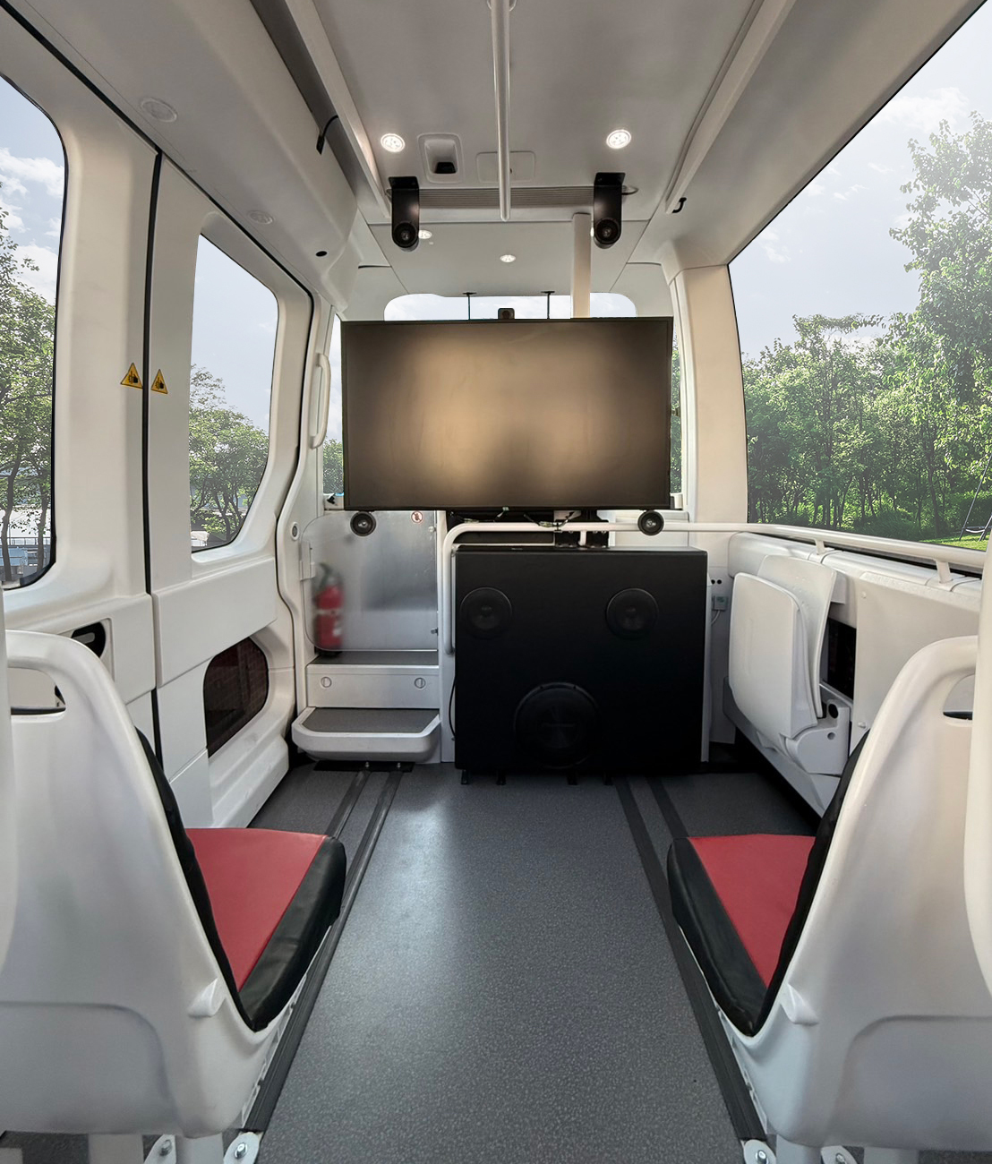 Enhances the bass and three-dimensional sound reproduction of the video content shown on the display installed in the vehicle, immersing the audience in the action being played out.