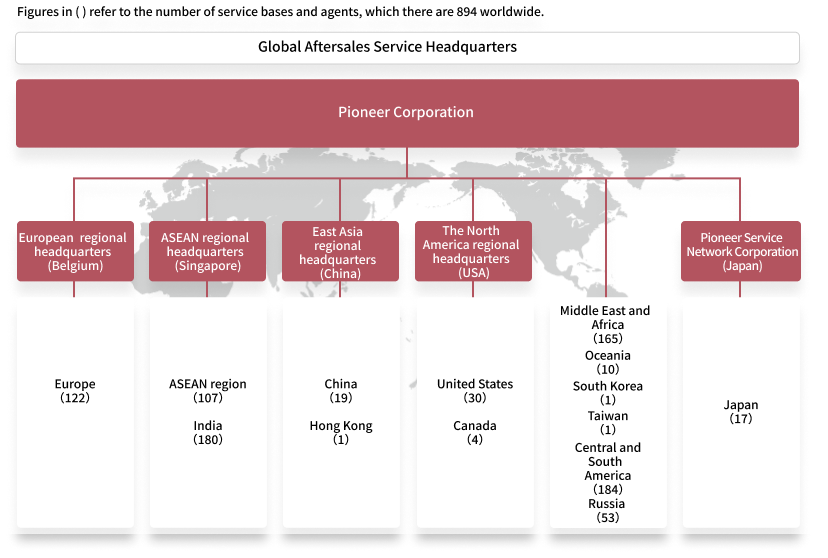 The Pioneer Group is working to build a framework of the highest quality support and services throughout the world. Each year, the Group conducts a customer satisfaction survey concerning its support and services. The results of each survey are channeled directly toward further improvements in customer satisfaction. In this manner, the Group is endeavoring to expand the circle of Pioneer enthusiasts. The Group consistently makes decisions from the customer's viewpoint, building relationships of trust by providing service that appeals to customers and meeting their expectations around the world