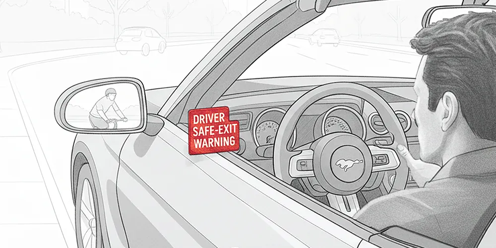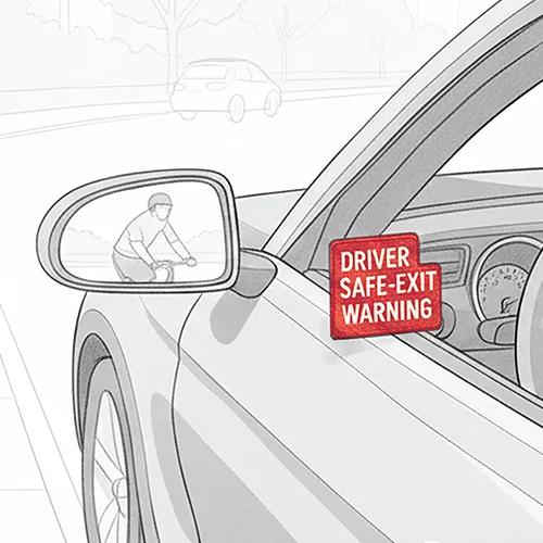 A camera-assisted safety feature that monitors approaching traffic on the driver side when the vehicle is stopped. Using a rear-mounted camera, the system scans for bicycles, vehicles, and other hazards, warning the driver before the door is opened to prevent accidents and side collisions.