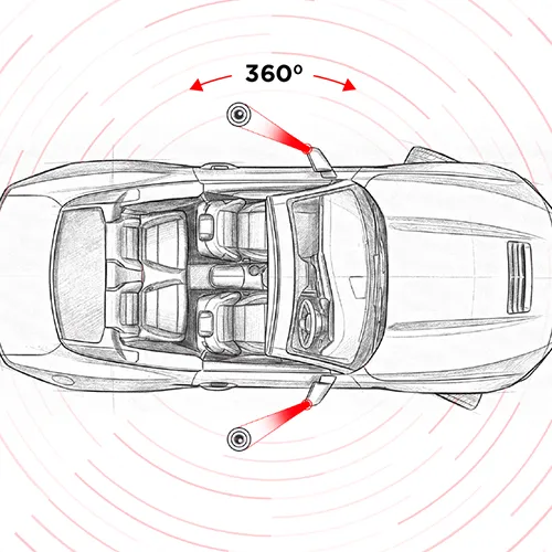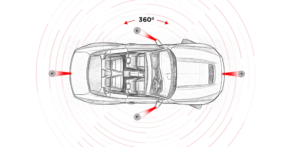 Combines video feeds from four ultra-wide cameras to deliver a stitched 540° real-time view of the vehicle’s surroundings, enhancing parking precision and driving safety in all conditions.